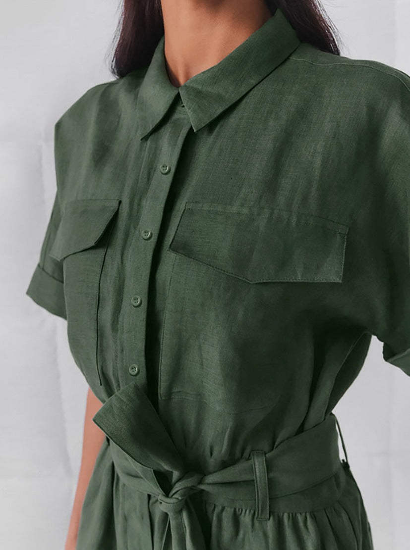 This women's short sleeve jumpsuit offers a perfect blend of chic design and casual ease. Featuring a button-up front, relaxed fit, and a stylish waist tie belt, it creates a flattering silhouette. Ideal for everyday wear, city strolls, or relaxed gatherings.
