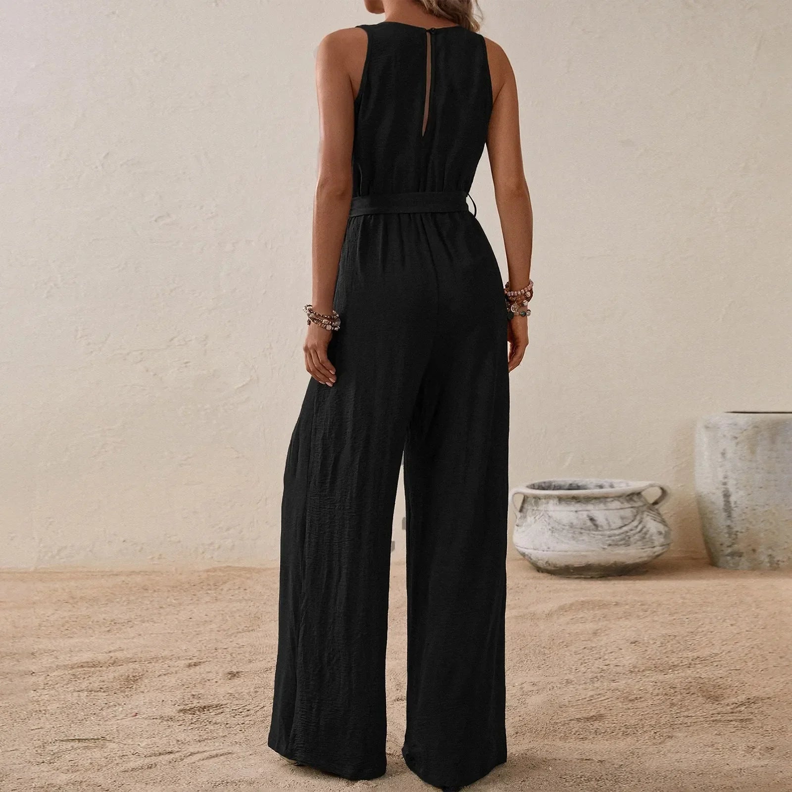 Women's Sleeveless Wide-Leg Jumpsuit with Waist Tie