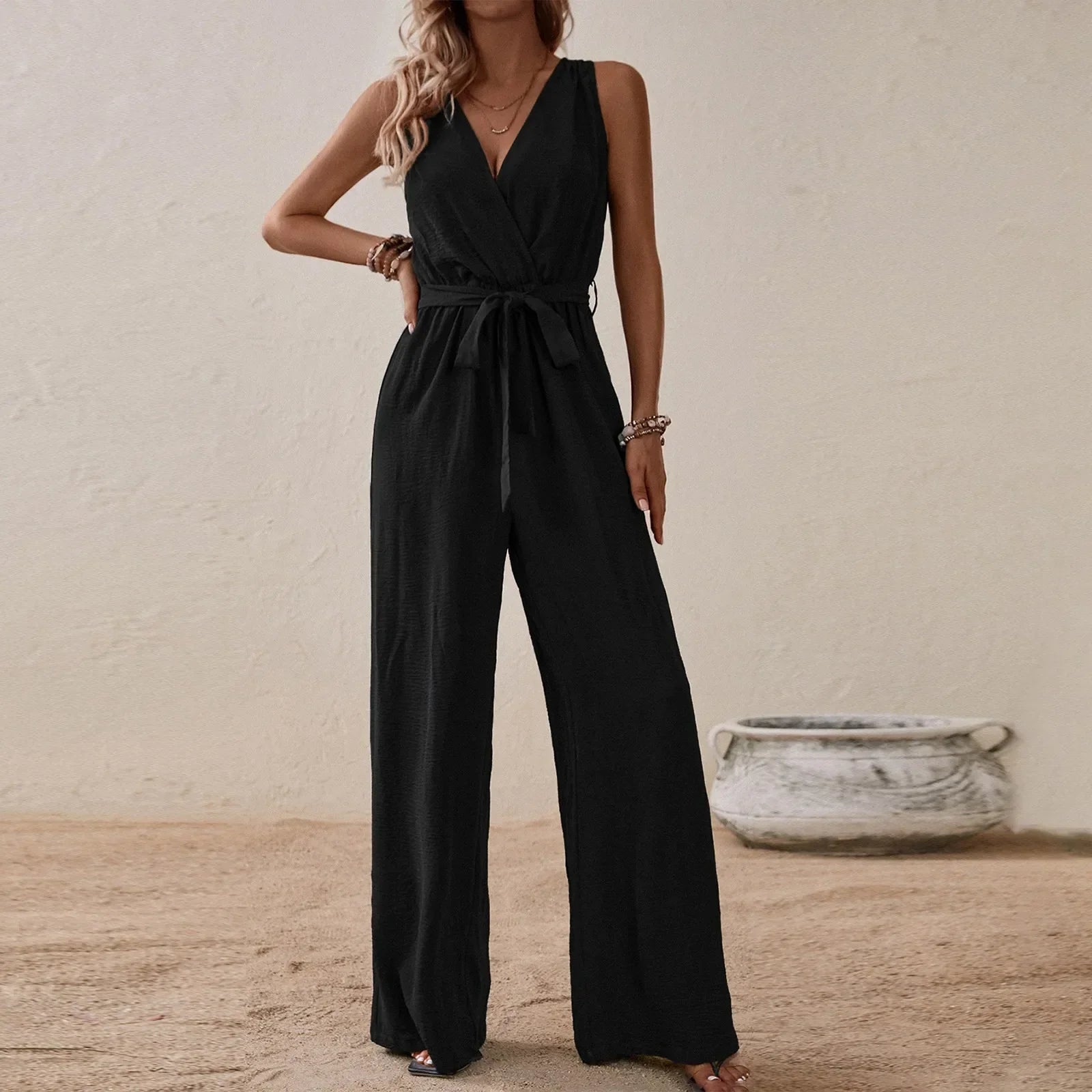 This women's sleeveless wide-leg jumpsuit brings together a clean, contemporary design with a figure-enhancing cut. The plunging wrap-style neckline and adjustable waist tie create a flattering shape, while the flowing pants deliver graceful movement. Perfect for everything from casual days to dressed-up evenings, this one-piece essential makes styling effortless.