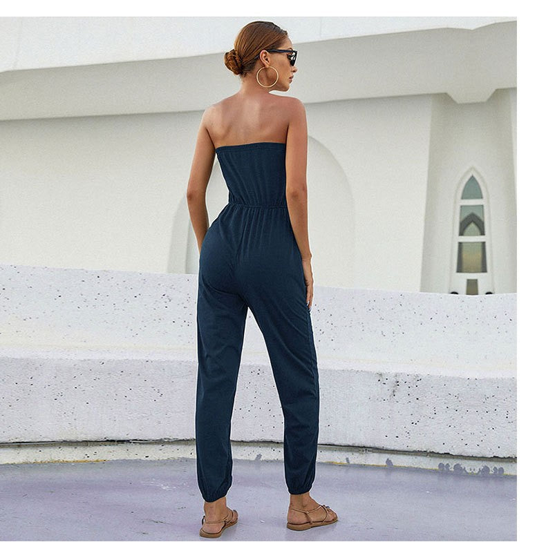 Women's Strapless Drawstring Waist Jumpsuit with Tapered Legs